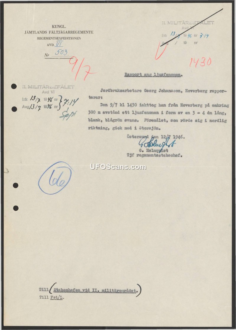 A report from the Swedish military regarding a July 1946 sighting of a shiny, blue-green object with a tail that descended into Lake Storsjön.