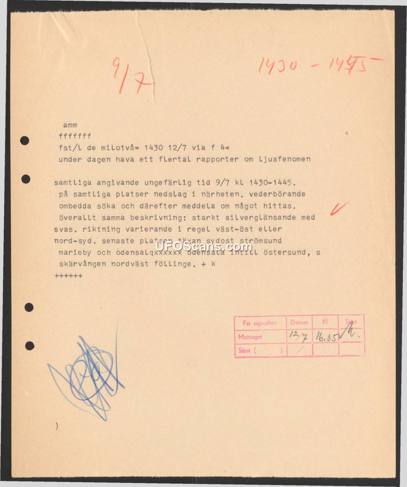 A Swedish military report documenting multiple sightings of a silver-shining light phenomenon on July 9th between 14:30 and 14:45. Authorities were tasked with searching the reported landing areas for evidence.
