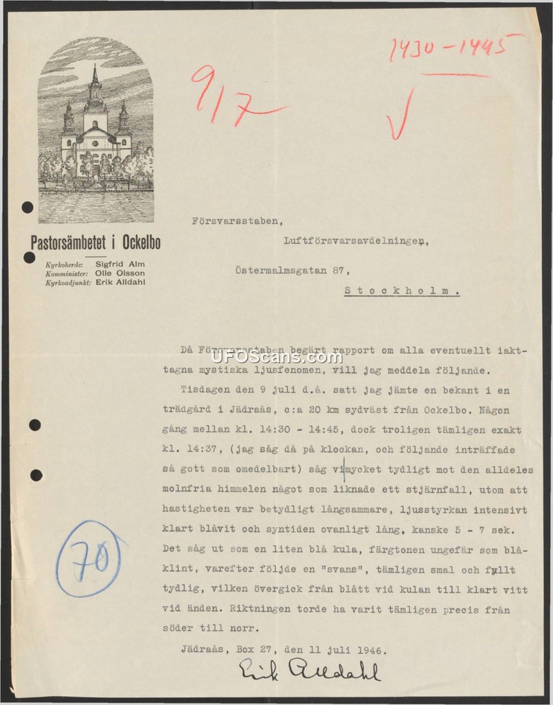 On July 11, 1946, Erik Alldahl, a curate (Kyrkoadjunkt) at the Pastorsämbetet in Ockelbo, Sweden, submitted a formal report to the Swedish Defense Staff (Försvarsstaben) regarding a mysterious light phenomenon he had witnessed. The report was written in response to a request from the Defense Staff for information concerning such sightings. Alldahl states that on Tuesday, July 9, 1946, at approximately 14:37, he was sitting in a garden in Jädraås, about 20 kilometers southwest of Ockelbo, with an acquaintance. He observed a phenomenon against a completely cloudless sky that resembled a shooting star, though he noted its speed was significantly slower. The object appeared as a small, intensely clear blue sphere, similar in color to a cornflower. It was followed by a tail that was narrow and clearly visible, which transitioned from blue near the sphere to clear white at its end. The duration of the sighting was estimated at five to seven seconds, and the object moved in a trajectory from south to north.