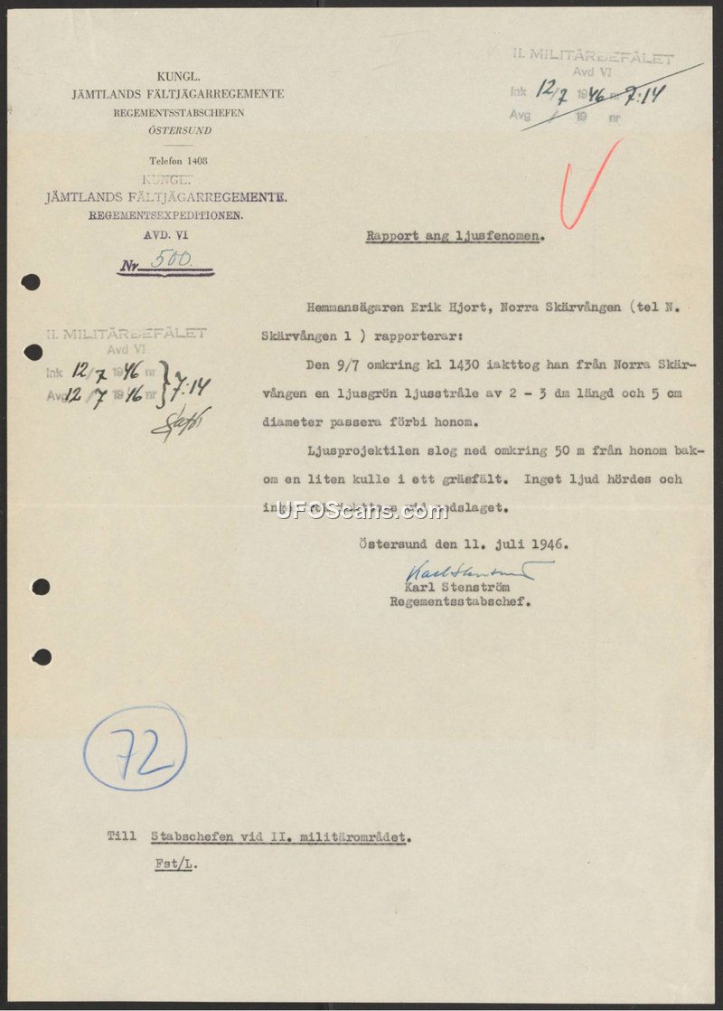 This document is an official report from the Royal Jämtland Field Rifle Regiment (Kungl. Jämtlands Fältjägarregemente) in Östersund, dated July 11, 1946. It documents a sighting reported by a local smallholder named Erik Hjort, residing in Norra Skärvången. According to the report, on July 9, 1946, at approximately 14:30, Mr. Hjort observed a light green beam of light passing by him. The object was described as being 2 to 3 decimeters in length and 5 centimeters in diameter. The report notes that the 'light projectile' struck the ground approximately 50 meters behind the witness, landing behind a small hill in a grassy field. The witness reported that no sound was heard during the event, and no smoke was observed at the site of the impact. The document is signed by Karl Stenström, the Regimental Chief of Staff, and is addressed to the Chief of Staff of the Second Military District (II. militärområdet).