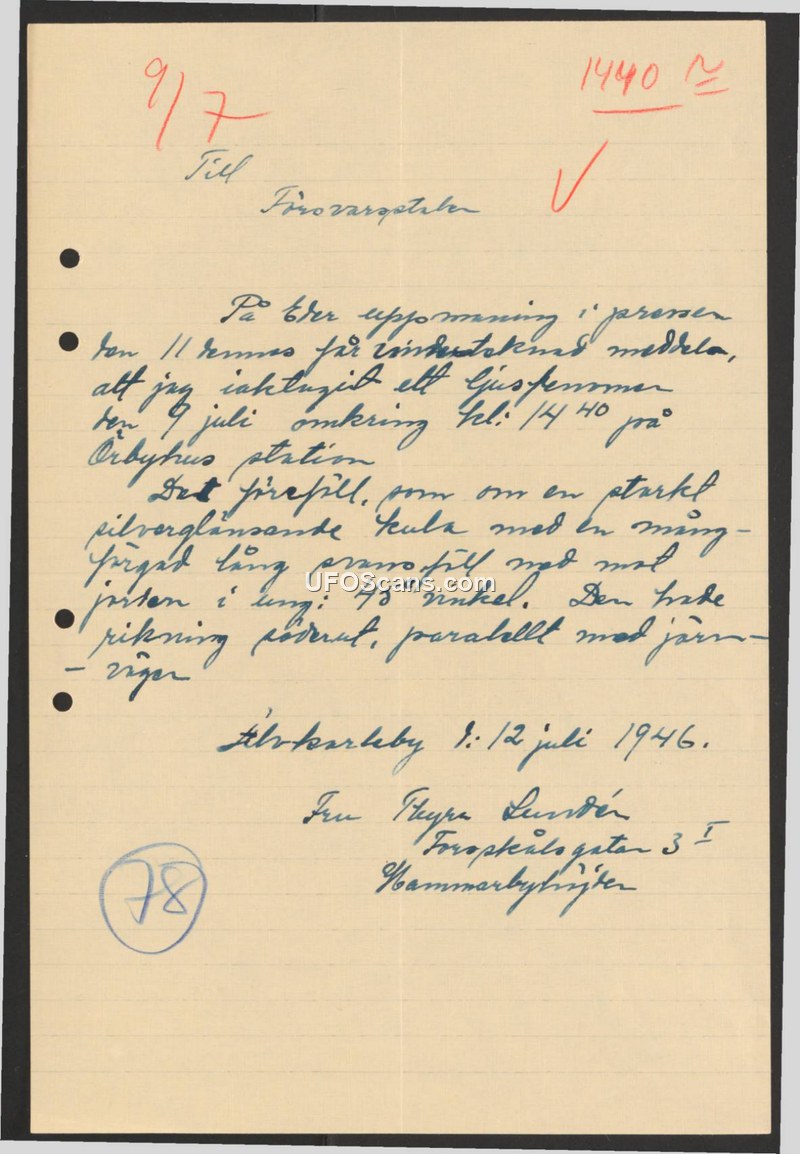 On July 12, 1946, Fru Thyra Lundén submitted a report to the Swedish Defense Staff (Försvarsstaben) regarding an aerial sighting she experienced on July 9, 1946. According to the report, at approximately 14:40, she observed an object at Årbyhus station. She described the object as a strongly silver-shining sphere with a multi-colored long tail. The object was moving at a 45-degree angle and traveling in a southerly direction, parallel to the railway line.