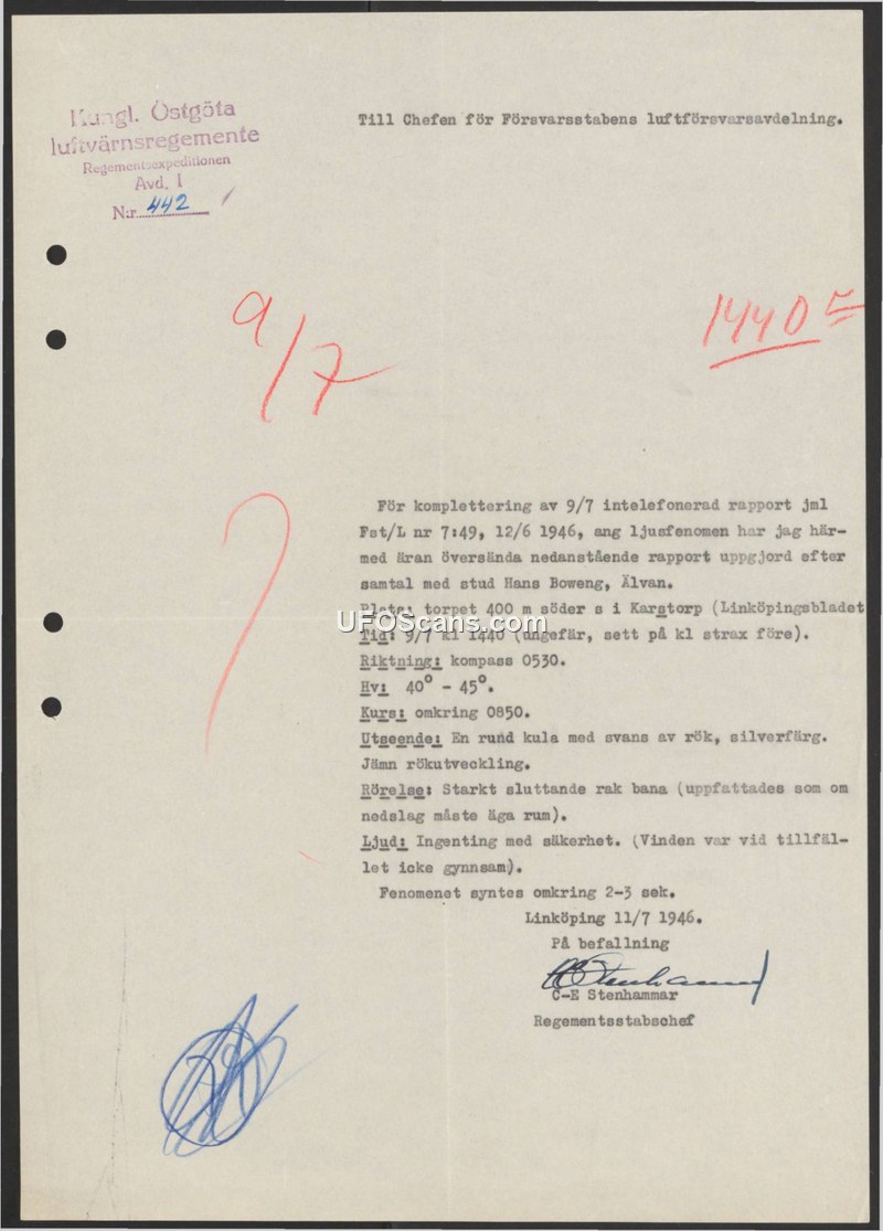 This document is a formal report issued by the Royal Östgöta Anti-Aircraft Regiment (Kungl. Östgöta luftvärnsregemente) on July 11, 1946, addressed to the Chief of the Defense Staff's Air Defense Department. The report serves as a supplement to a previously telephoned report (Fst/L nr 7:49) regarding a light phenomenon observed on July 9, 1946. The information was gathered following an interview with a student named Hans Boweng from Älvan. The sighting occurred at approximately 14:40 on July 9, 1946, near a croft 400 meters south of Karsatorp. The witness described the object as a silver-colored round ball with a tail of smoke, exhibiting even smoke development. The object was observed on a strongly descending straight path, which gave the witness the impression that a crash was imminent. The phenomenon was visible for approximately 2 to 3 seconds. Regarding sound, the witness could not confirm any, noting that the wind conditions at the time were unfavorable. The report is signed by C-E Stenhammar, the Regimental Chief of Staff.