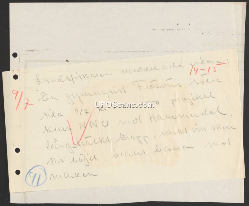 A handwritten report of an unidentified object with a long body observed by a gymnast over Frösön, Sweden, on September 7th, moving towards Hamnerdal.
