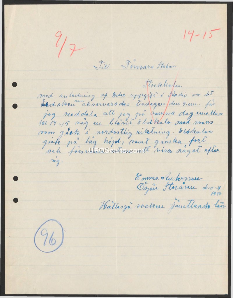 A witness report sent to the Swedish Defence Staff regarding a blue fireball observed in Hällesjö on July 9, 1946. The object was described as moving fast at a low altitude before disappearing.