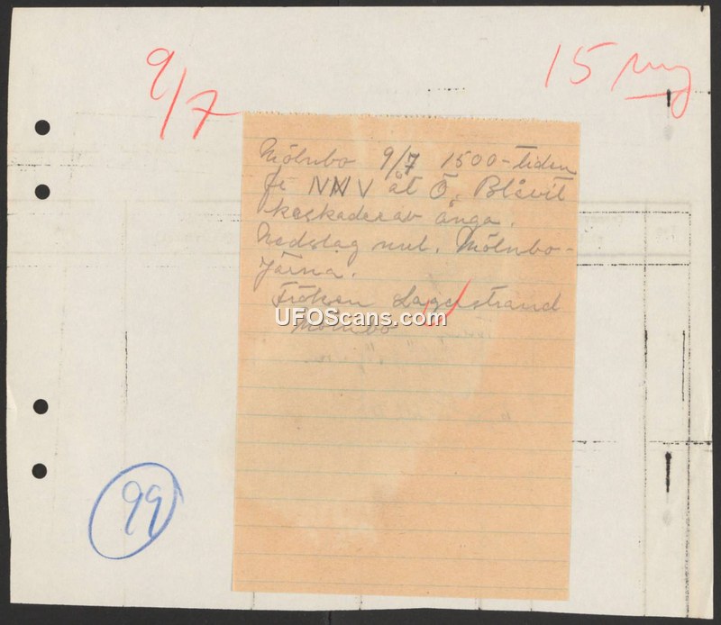 A handwritten report of a July 9 sighting in Mölnbo, Sweden, by a witness named Fröken Lagerstrand. The witness observed what appeared to be cascades of steam moving in a north-northwesterly direction.