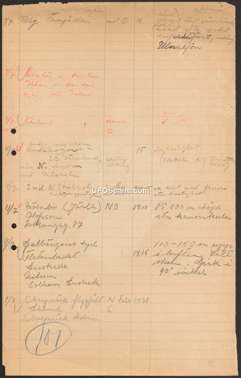 A handwritten log from July 1947 documenting multiple aerial sightings across Sweden. The reports describe objects exhibiting high speeds and unusual flight maneuvers.