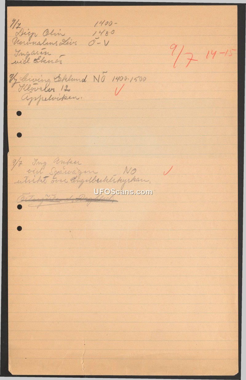 A handwritten log from July 7th documenting three separate reports by individuals named Olin, Eklund, and Anker in Sweden. The entries include times and locations associated with the observations.