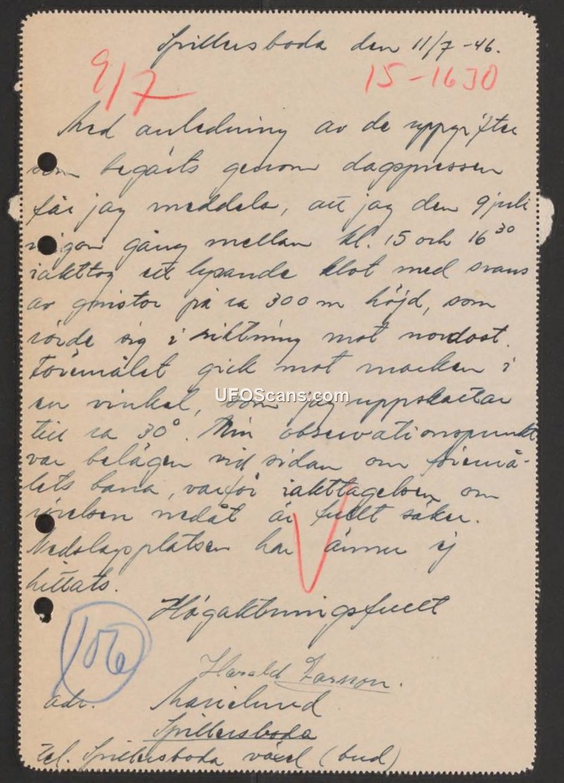 Sighting Report — Spillersboda, Sweden, July 9, 1946