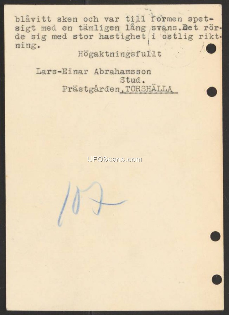 This document is a brief, personal report from an individual named Lars-Einar Abrahamsson, a student residing at Prästgården in Torshälla. The author describes observing an unidentified aerial object characterized by a blue-white glow. The object was described as being pointed in shape and possessing a fairly long tail. Regarding its movement, the witness noted that the object traveled at a high rate of speed in an easterly direction. The report is signed respectfully by the author.