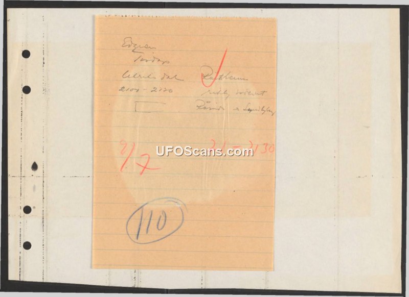 This document is a brief, handwritten note containing minimal information regarding a sighting. The text indicates a time frame of 2100-2130. Other handwritten notations include the numbers 9/7, 21-2130, and the number 110 circled. The document is highly fragmentary and lacks context, specific location data, or descriptive details regarding the nature of the sighting.