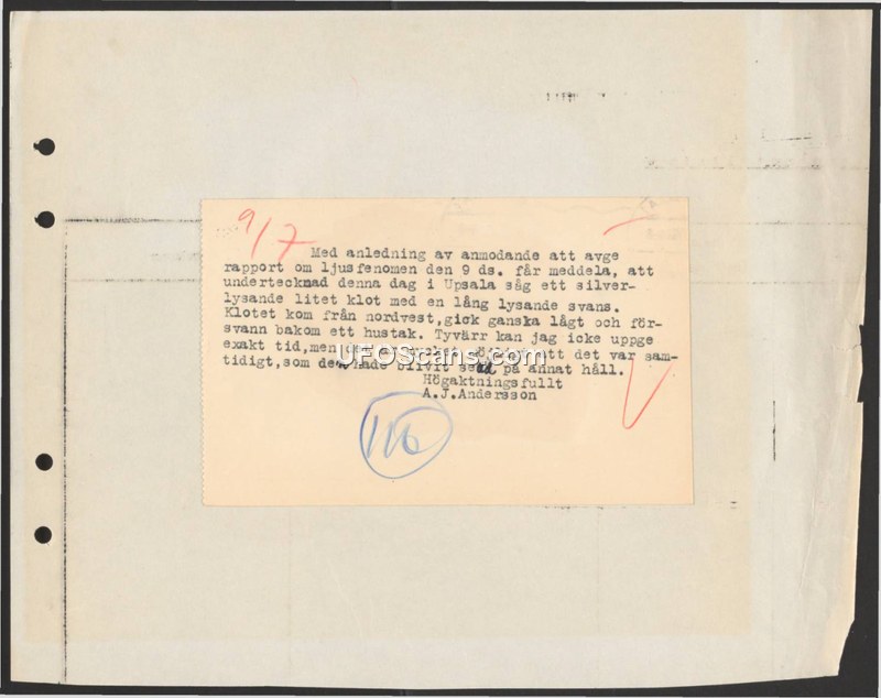 This document is a brief, formal report written by A.J. Andersson regarding a light phenomenon observed in Upsala, Sweden, on the 9th of an unspecified month. In response to a request for information, Andersson describes witnessing a small, shining silver sphere equipped with a long, luminous tail. The object approached from the northwest, traveled at a low altitude, and eventually disappeared behind a house. Andersson notes that he is unable to provide the exact time of the sighting, though he suggests it is possible the event was observed simultaneously from other locations.