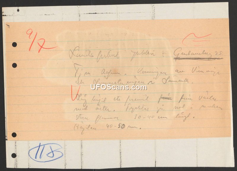 A handwritten field note documenting an object found at Grubenberg 85 measuring 30-40 cm in length and 40-50 mm in height.