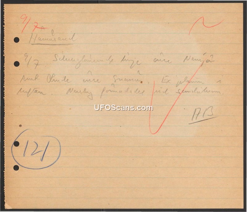 A brief, handwritten German field note dated 9/7 containing cryptic references to a sighting, a protective flame, and a sandstorm. The document is identified by the number 121.