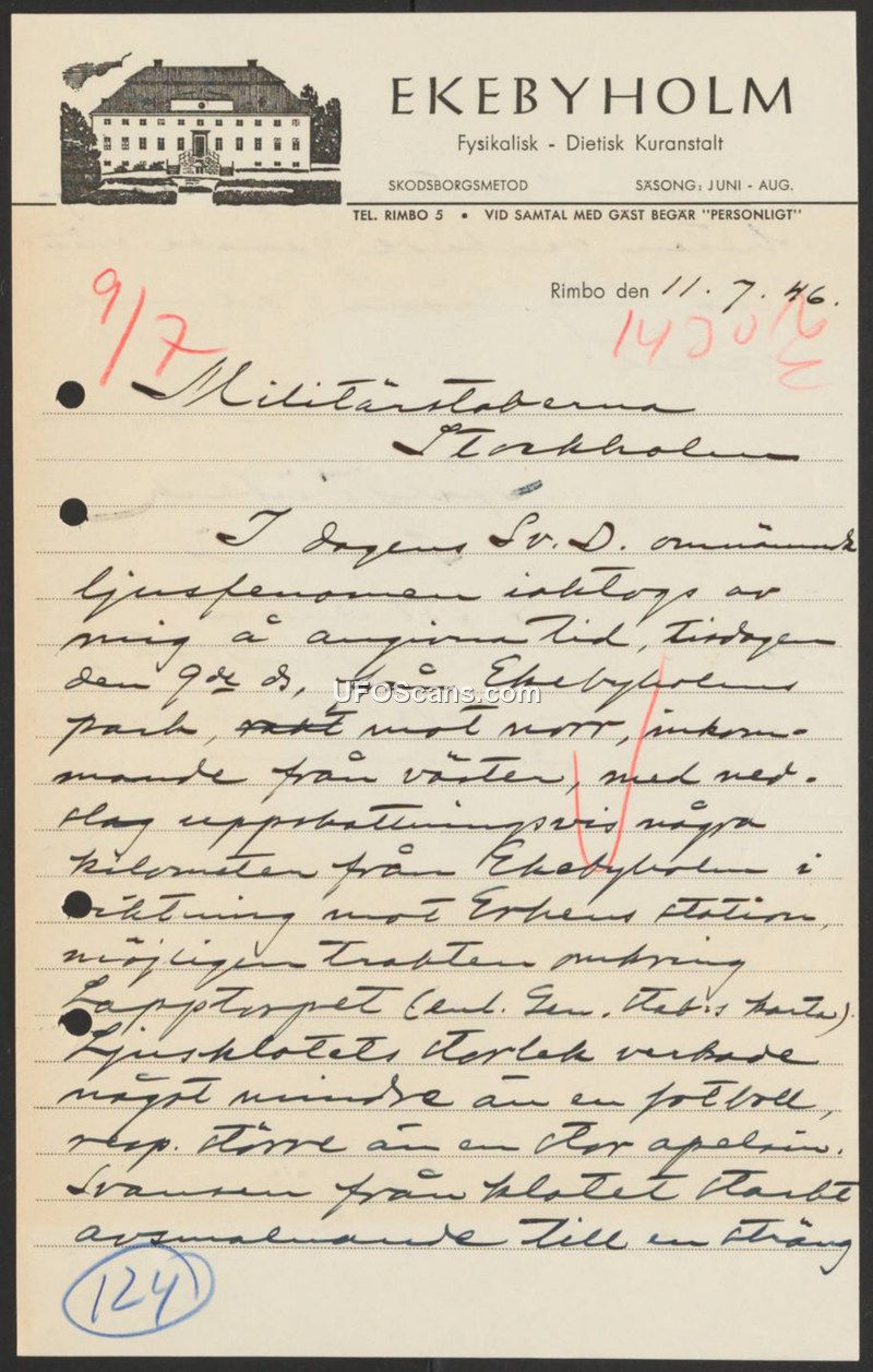 Sighting Report - Ekebyholm, Sweden, July 9, 1946