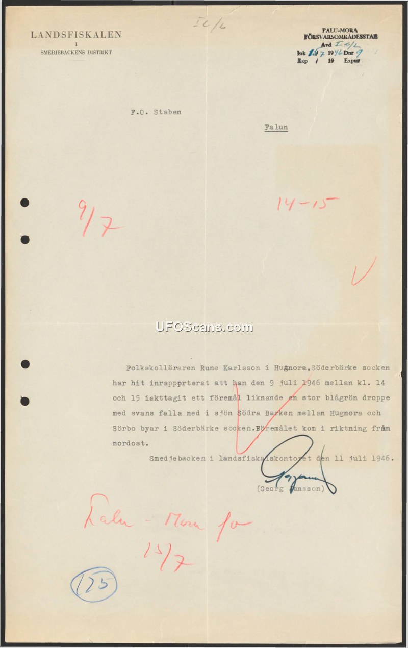 A Swedish schoolteacher reported observing a blue-green, tail-bearing object falling into Lake Södra Barken on July 9, 1946. The report was filed by the local district authority to the military defense staff in Falun.