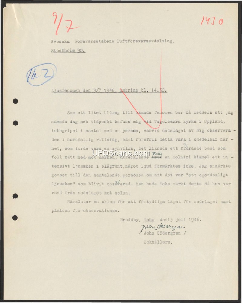 On July 15, 1946, John Södergren, a bookkeeper, submitted a report to the Swedish Defense Staff's Air Defense Department regarding a light phenomenon he witnessed on July 9, 1946, at approximately 14:30. Södergren was located at Tegelsmora church in Uppland, engaged in conversation with another person, when he observed an object in a northeasterly direction. He described the object as appearing like a band falling straight toward the ground. The phenomenon occurred in a cloudless sky and emitted an intense blue-green light. Södergren noted that no sound was associated with the event. He immediately pointed out the 'peculiar light' to his companion, though the companion had not noticed it as he was facing away from the incident toward the sun. Södergren speculated that the event might have been an optical illusion. He included a sketch with his report to clarify the location of the incident and his observation point.