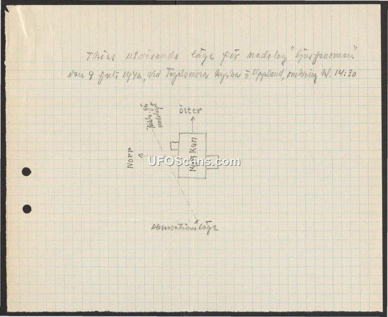A report of a light phenomenon observed near Tegelsmora Church, Sweden, on February 9, 1976. It includes a hand-drawn diagram of the site.
