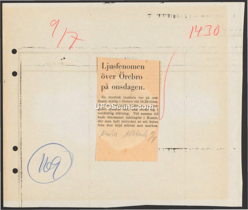 A newspaper report describes a light green glowing sphere observed over Örebro and Kumla, Sweden, on a Wednesday afternoon. The object was seen moving northeast and appeared to fall from a great height.