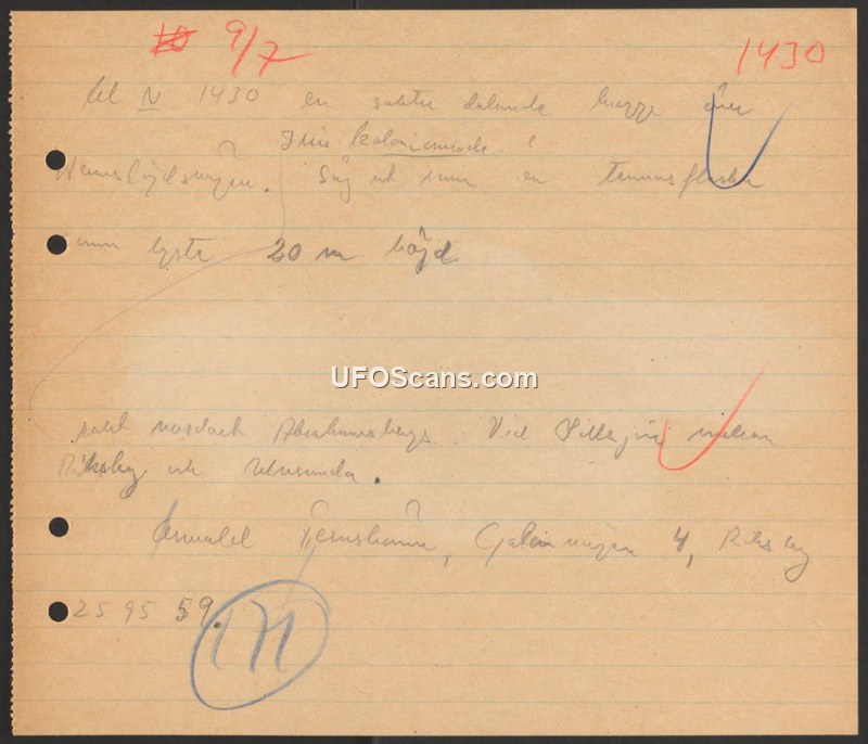 A handwritten report of an aerial sighting at 14:30 hours at an altitude of 20 meters, located north of Akeshumsberg, Sweden.