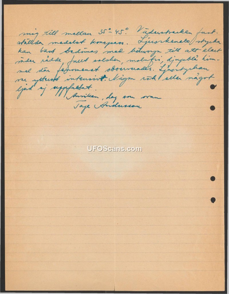 A handwritten report by Tage Andersson describing an intense light phenomenon observed in a clear, cloudless sky. The observer confirms no associated sound or smoke was detected.