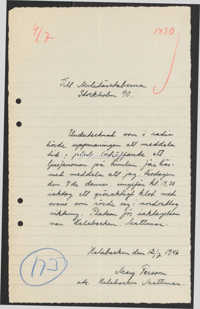 A 1946 report from a witness named Mary Person to the Swedish Military Staff describing the sighting of a luminous, tailed object in the sky over Kalabacken.