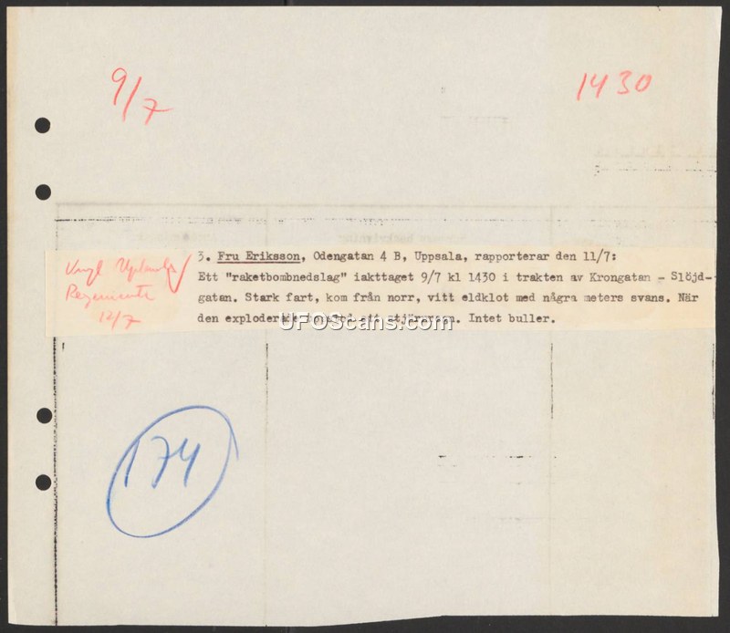 This document is a brief report concerning a sighting in Uppsala, Sweden, on July 9th. A witness, identified as Fru Eriksson of Odengatan 4 B, reported observing what she described as a 'rocket bomb impact' in the area between Krongatan and Slöjdgatan at 14:30. According to the report, the object was a white fireball with a tail measuring a few meters in length. It was observed moving at a high speed from the north. Upon reaching its destination, the object reportedly exploded, resulting in a 'shower of stars.' The witness explicitly noted that there was no sound associated with the event.