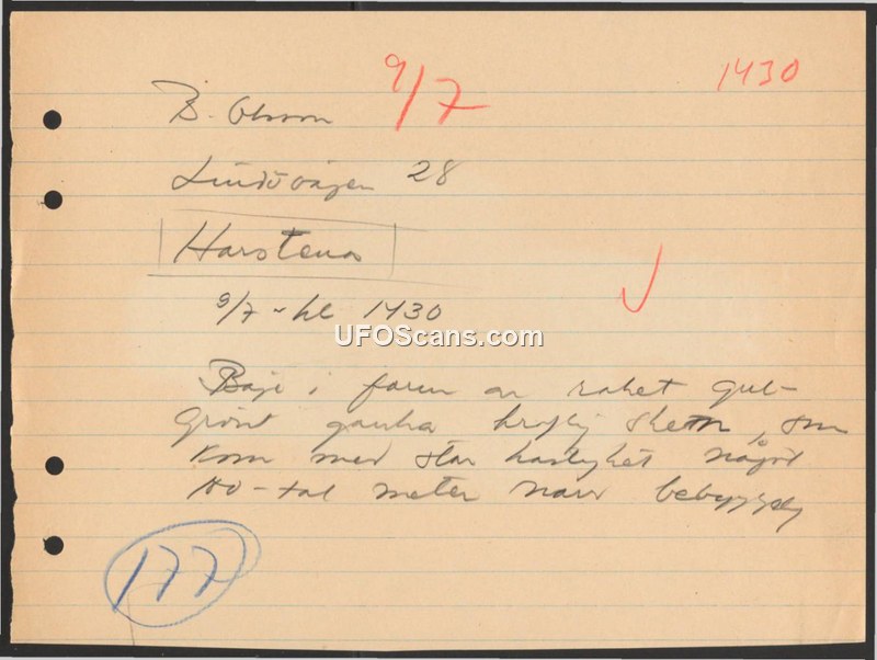 A handwritten report from September 7 documenting a high-speed, yellow-green object observed near buildings in Harstena, Sweden.