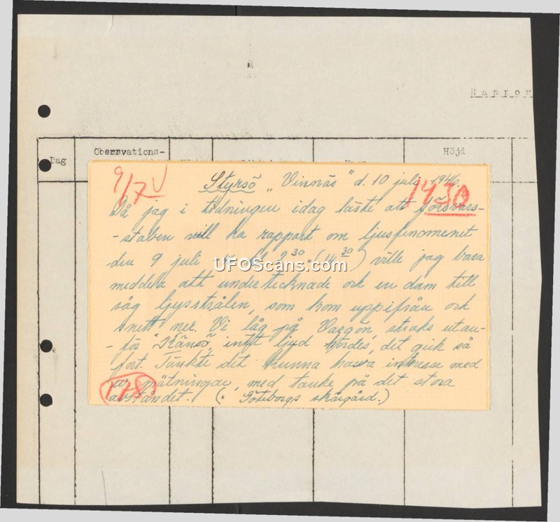 A witness report from July 1946 describing a fast-moving light beam observed near Styrsö, Sweden. The report was submitted in response to a public request for information from the Swedish Defense Staff.