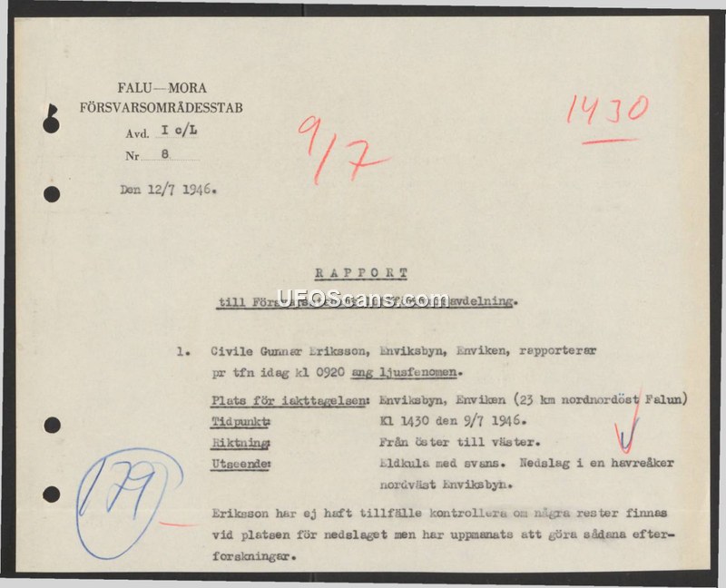 A 1946 Swedish military report documenting a civilian sighting of a fireball with a tail that reportedly impacted an oat field near Enviksbyn. The witness was instructed to investigate the site for physical evidence.