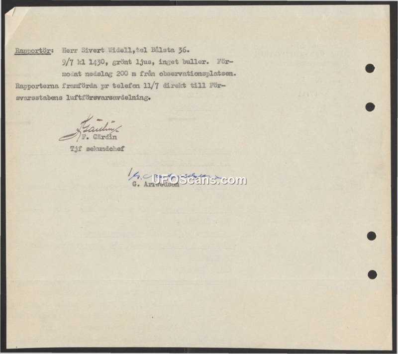 A report of a silent green light observed on July 9, 1947, with a suspected impact site 200 meters from the witness. The report was submitted to the Swedish Defense Staff's Air Defense Department.
