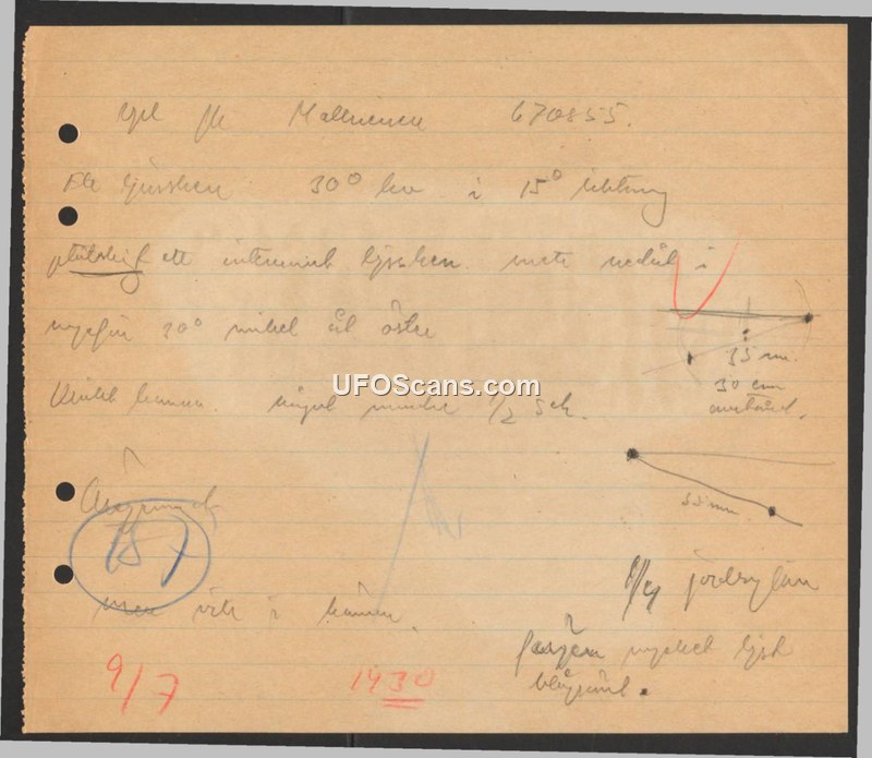 The document describes a brief sighting of a light lasting approximately half a second, moving 20 degrees to the east at an elevation of 30 degrees.