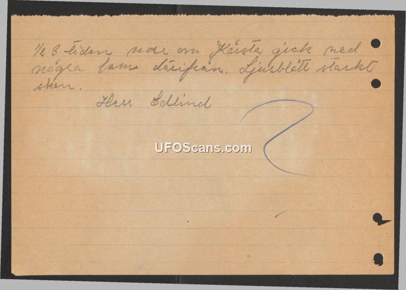 A handwritten note documenting a sighting of a light blue object near Kärsta at 8:30 by a witness named Herr Edlind.