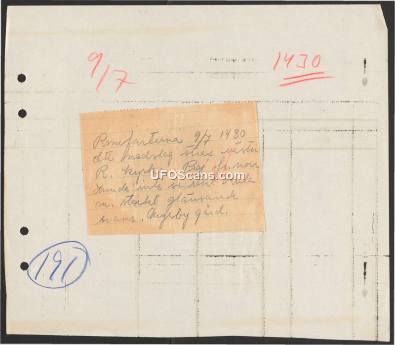 This document is a brief, handwritten sighting report dated July 9, 1480. The report describes an unidentified aerial phenomenon observed in Romefartuna, Sweden, specifically located just west of the R. church near Myrsby farm. The witness describes the object as having a strongly shining tail. The report notes that no smoke was observed. The document contains the reference number 1430 and the number 917, along with a circled number 191.
