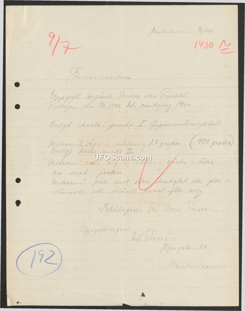 A 1946 Swedish military report documenting a high-speed aerial object observed moving west-to-east with a bluish trail. The witness was identified as Mrs. Doris Persson of Kristinehamn.
