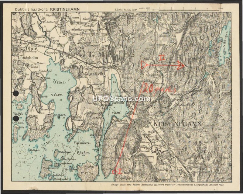 A 1935 topographic map of Kristinehamn, Sweden, featuring handwritten red ink annotations indicating a directional path and a 20-degree measurement.
