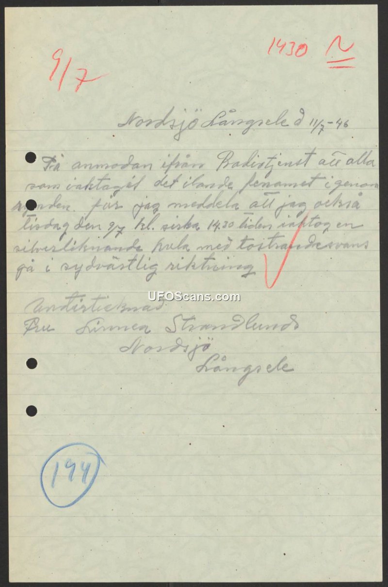 Sighting Report — Nordsjö Långsele, July 9, 1946