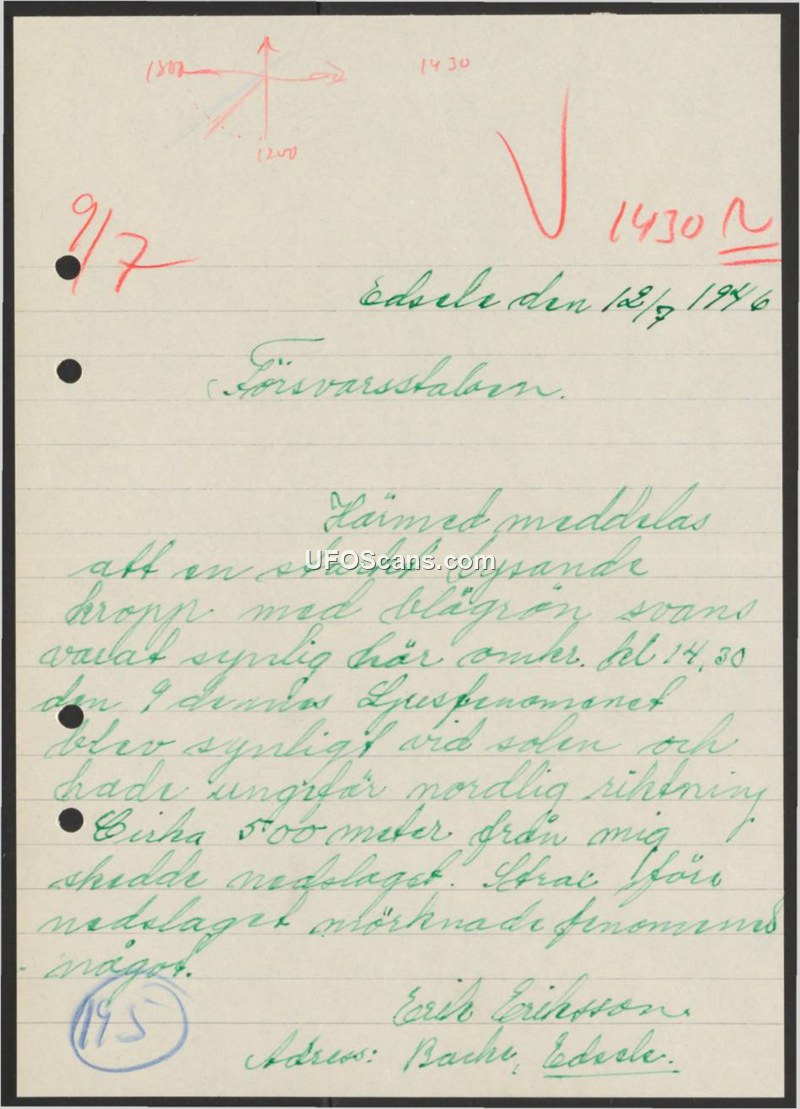 Sighting Report — Edsele, Sweden, July 9, 1946