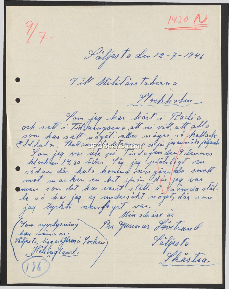 On July 12, 1946, Per Gunnar Lövstrand wrote to the Military Staffs in Stockholm to report an aerial sighting. He stated that he had heard in the radio and read in the newspapers that the authorities were interested in reports from anyone who had seen so-called 'fireballs'. Lövstrand reported that on Tuesday, July 9, 1946, at approximately 14:30, he suddenly observed such a ball descending toward the ground. He noted that he was a bit away from the location and did not investigate the site further, as he did not find it necessary. The document provides his location as Säljesta, in the province of Hälsingland.