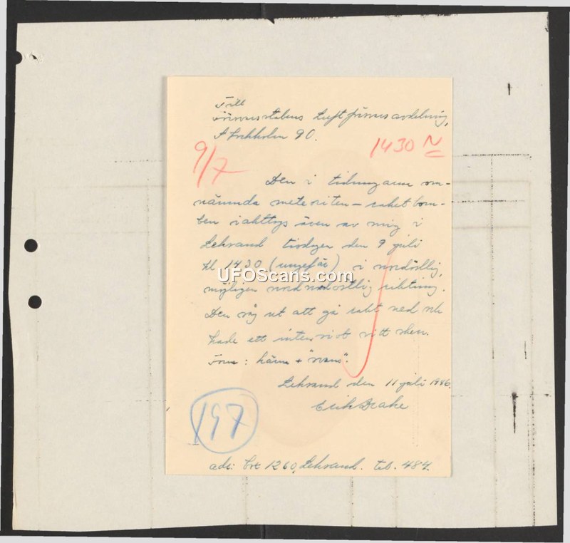 A personal sighting report from Erik Brahe regarding a meteorite observed in Lehrand, Sweden, on July 9, 1986. The report was submitted to the Swedish Defense Staff.