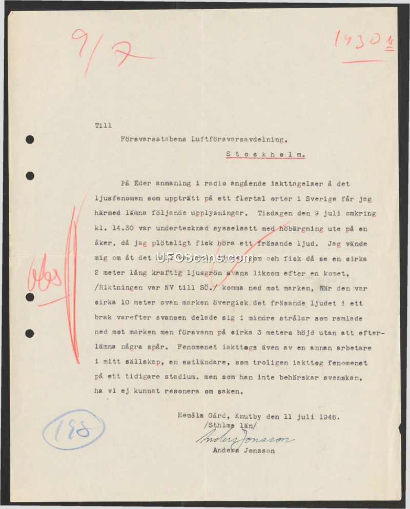 On July 11, 1946, Anders Jonsson wrote to the Air Defense Department of the Swedish Defense Staff (Försvarsstabens Luftförsvarsavdelning) in response to a radio appeal for information regarding light phenomena observed across Sweden. Jonsson reported that on Tuesday, July 9, 1946, at approximately 14:30, he was working on a field at Hemåla Gård in Knutby. He heard a hissing sound and turned to see a light-green, comet-like object, approximately two meters long, moving from the northwest toward the southeast. When the object reached an altitude of about 10 meters above the ground, the hissing sound transitioned into a loud crack. The object's tail then split into smaller rays that fell toward the ground but vanished at a height of approximately three meters without leaving any physical traces. Jonsson noted that an Estonian worker in his company also witnessed the event, possibly at an earlier stage, but they were unable to discuss the details due to the language barrier.