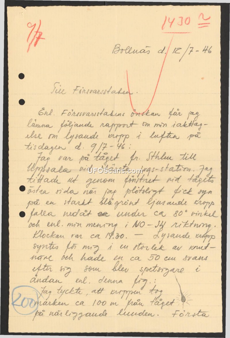 Sighting Report of Luminous Object — Bollnäs, Sweden, July 9, 1946