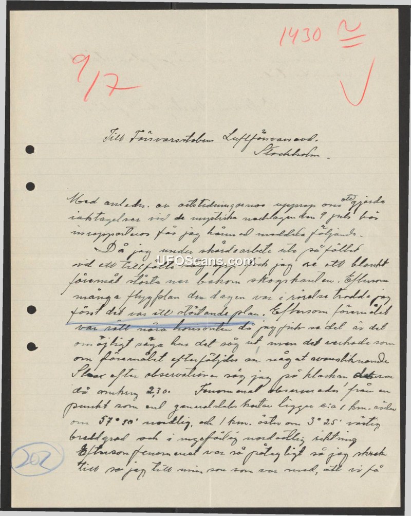 This document is a letter addressed to the Air Defense Department of the Swedish Defense Staff in Stockholm. The author reports a sighting that occurred on July 9th while they were performing harvest work in a field. The witness observed a shiny object moving behind the treeline. Initially, the witness believed the object to be an airplane, as there were many planes in the area that day. However, because the object was close to the horizon, the witness found it impossible to describe its appearance, though it seemed to be followed by something that looked like a plane. The observation was made at approximately 2:30. The witness provides coordinates for the location of the observation as 57 degrees 30 minutes north and 3 degrees 25 minutes east.
