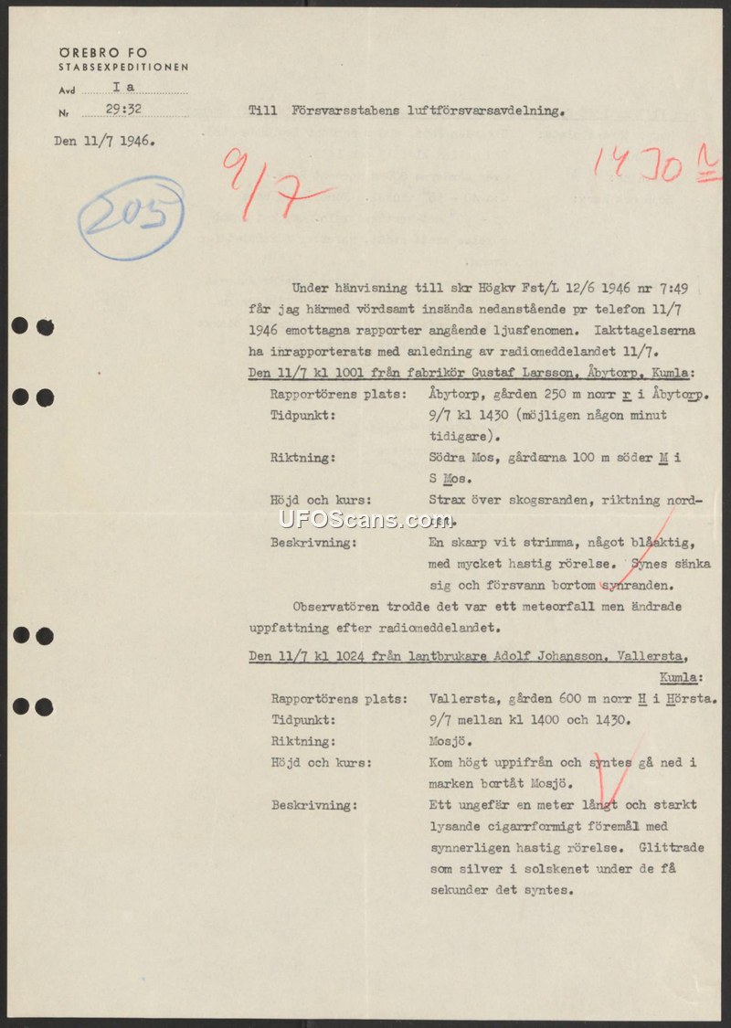 A 1946 Swedish military report documenting two civilian sightings of rapid, luminous aerial objects in the Kumla region. The reports were submitted following a public radio appeal for information regarding light phenomena.