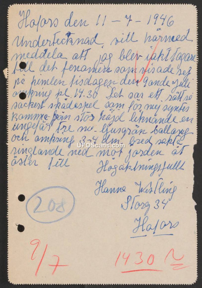 On July 11, 1946, an individual named Hanne Wesling, residing at Storg 34 in Hofors, Sweden, authored a report regarding an aerial sighting that occurred two days prior. According to the document, on Tuesday, July 9, 1946, at approximately 14:30, the witness observed an unidentified object in the sky. The witness described the object as appearing to descend from a great height, resembling a light-gray balloon approximately 3 to 4 meters in width. The object was observed drifting slowly downward toward the east. The report is signed by Hanne Wesling and includes a reference number, 208, as well as the date of the report and the time of the incident.