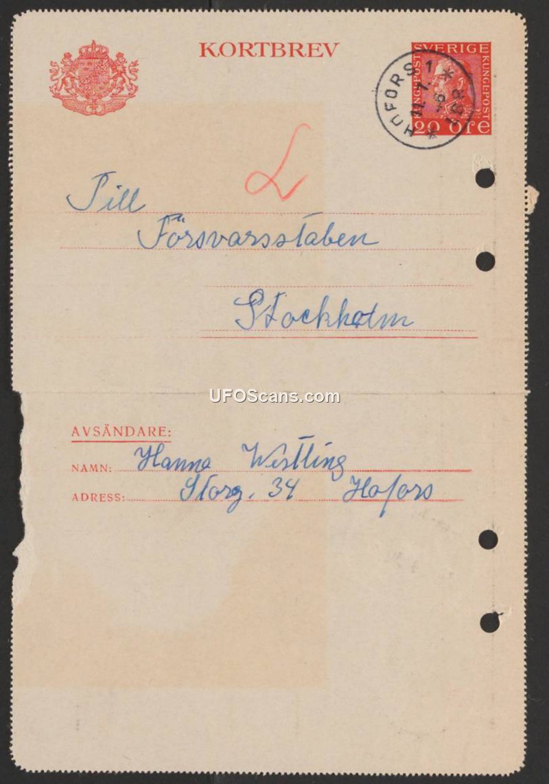 A letter card sent by Hanna Wistling of Hofors to the Swedish Armed Forces Staff in Stockholm. The document provides sender and recipient information but contains no details regarding the subject matter.