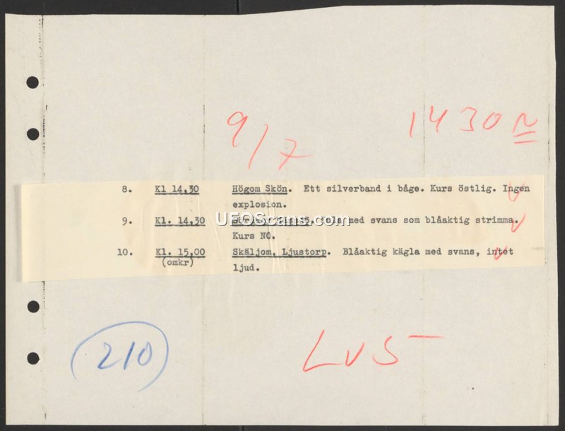 A log of three separate aerial observations in Sweden, describing various shapes including a silver band, a sphere, and a cone, all featuring tails or streaks.