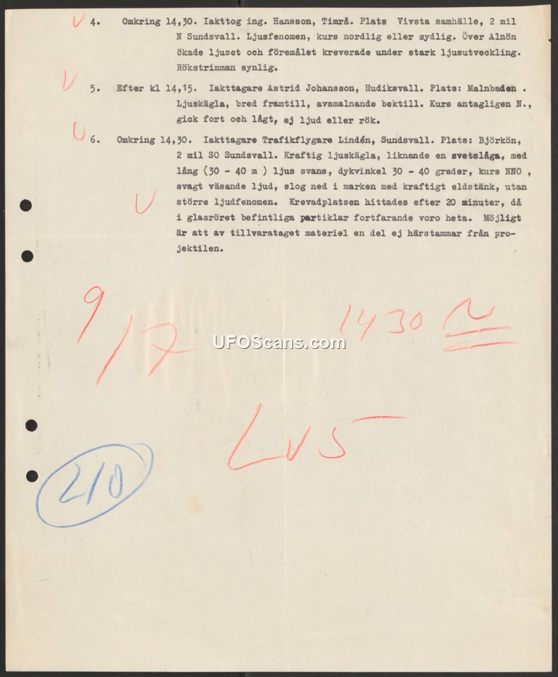 Three separate sightings of light phenomena were reported in the Sundsvall region. One incident involved a descent and impact, where hot particles were recovered from a glass tube at the site, with a note that some material might not originate from the projectile.