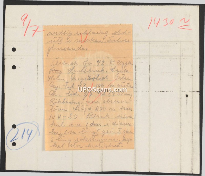 A handwritten report from July 9, 1948, documenting a sighting of a silver, spherical object with a green and smoke trail over Ostra Ny, Sweden.