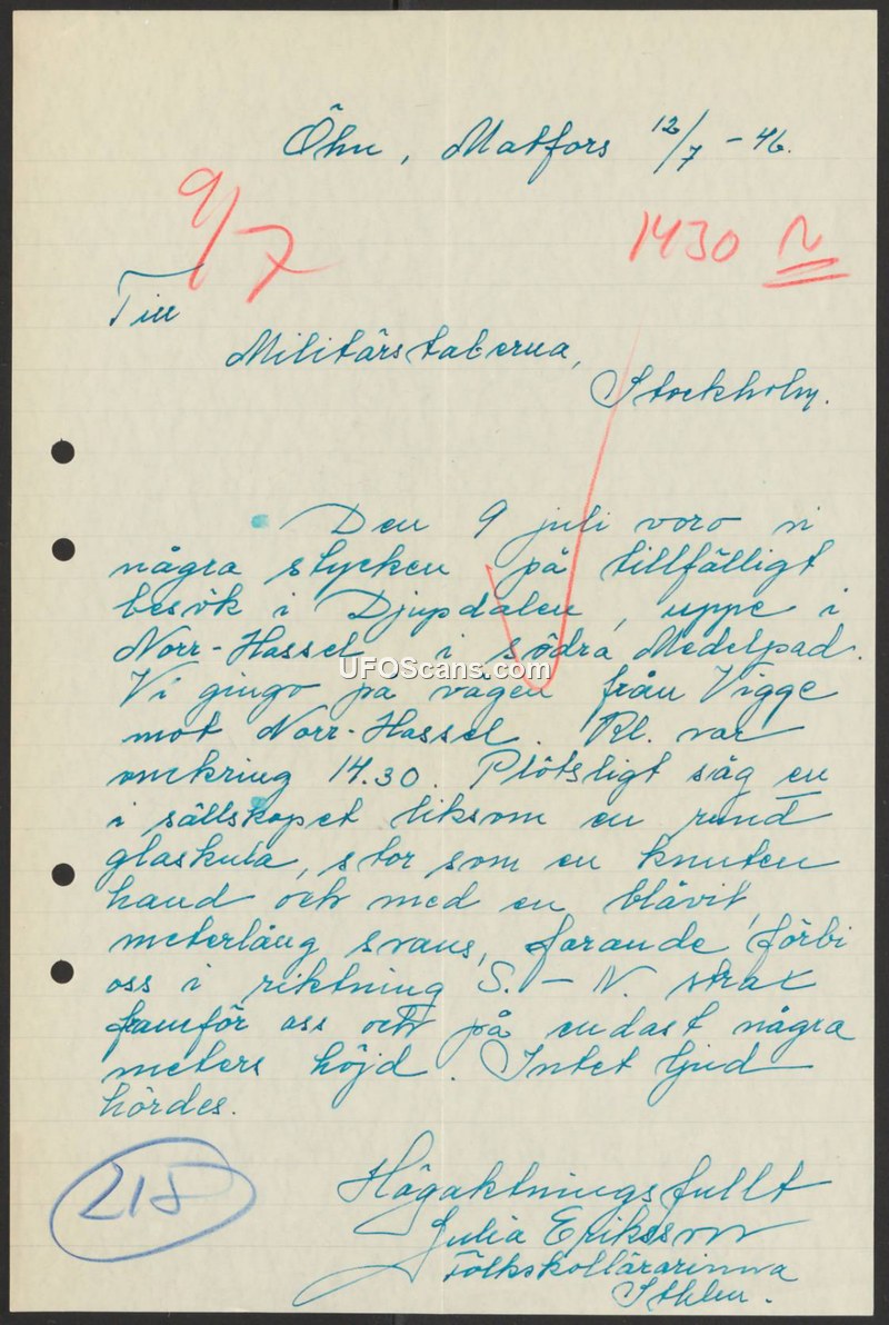 On July 12, 1946, Julia Eriksson, a primary school teacher, wrote to the Military Staffs in Stockholm to report an aerial sighting that occurred on July 9, 1946. At approximately 14:30, while in the area of Djupdalen, Norr-Hassel, in southern Medelpad, Eriksson and others were walking on the road from Vigge toward Norr-Hassel. During this time, the group observed an object described as a round glass ball, approximately the size of a clenched hand. The object featured a blue-white tail about a meter long. It traveled past the witnesses in a south-westerly direction at a low altitude of only a few meters. Eriksson noted that no sound was heard during the event. The document is signed by Eriksson in her capacity as a teacher.