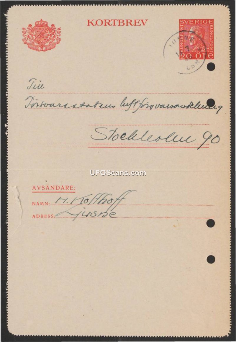 This is a letter card sent by H. Kolthoff from Ljusne to the Swedish Air Defense Department in Stockholm. It represents formal communication with military authorities.